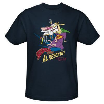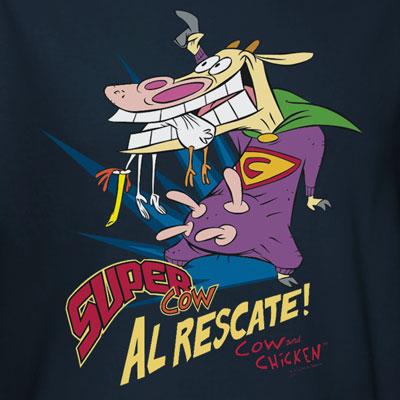 This 100% cotton navy Cow and Chicken "Super Cow" t-shirt featuring is available in adult sizes.